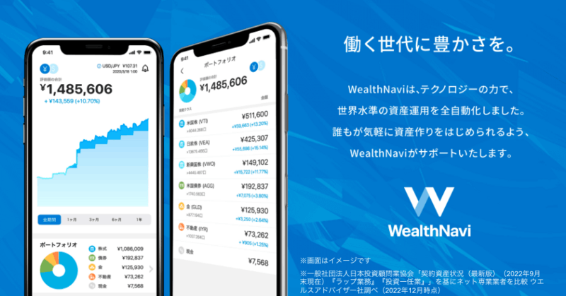 ウェルスナビは #働く世代に豊かさを というミッションのもと、日本の働く世代の豊かな老後に向けた資産形成をテクノロジーの力でサポートする会社です。