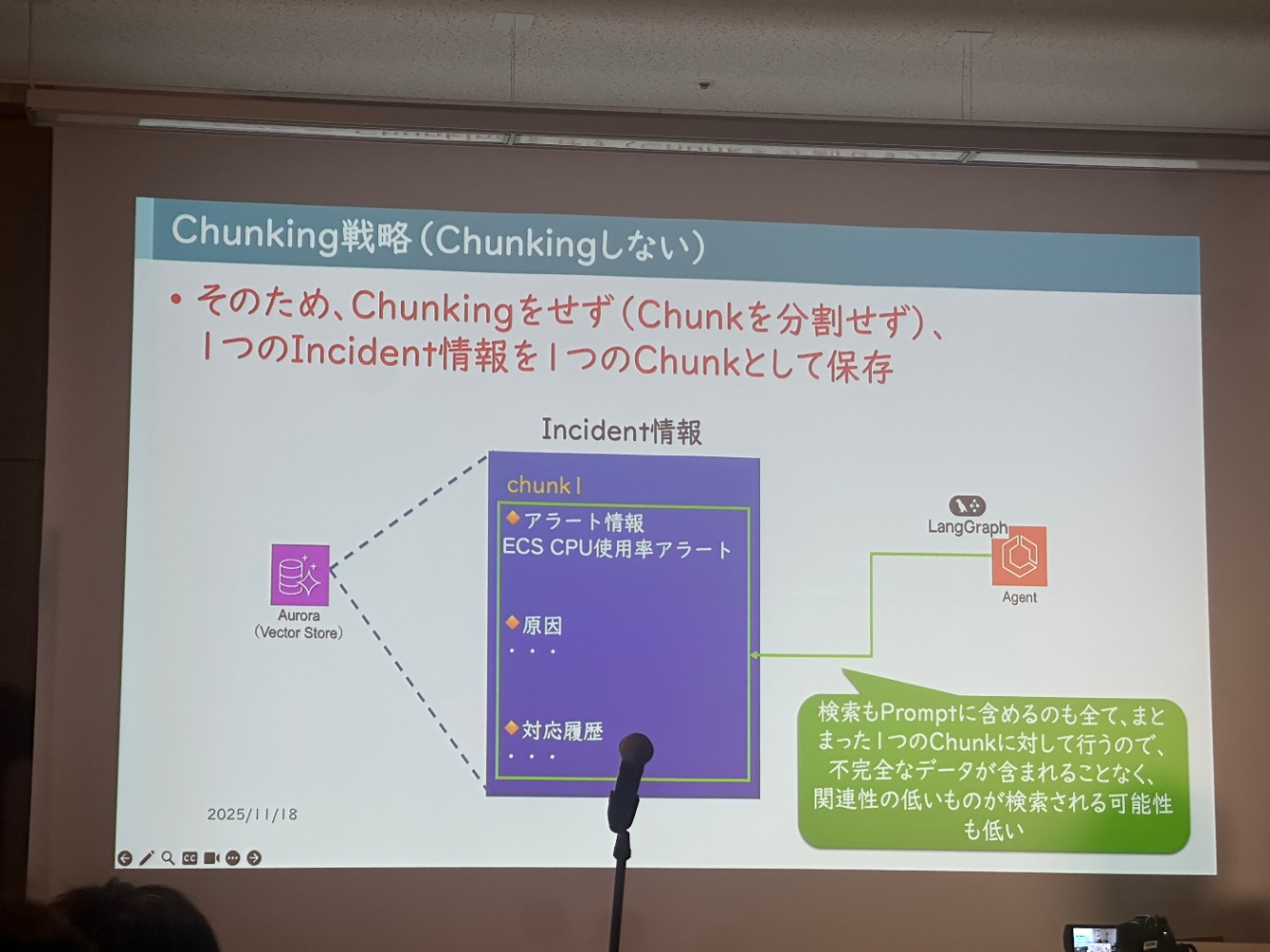 またVector StoreとしてBedrock KnowledgeBaseを使用した点で、あえてチャンキングは行わずIncident情報を一つのチャンクとして保存しているというのが斬新なアプローチだと思いました。
