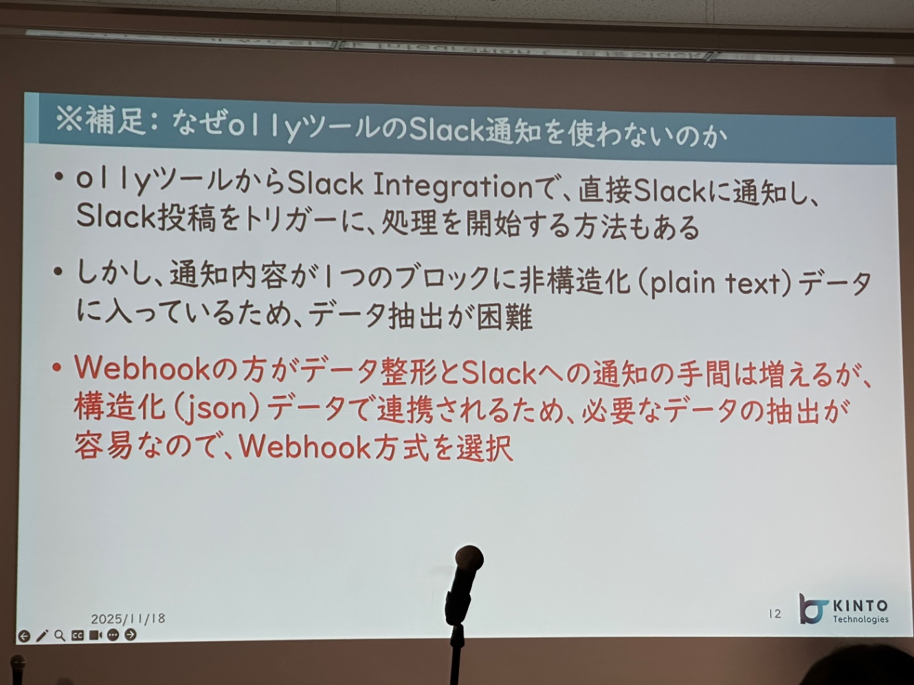 監視ツールのSlack通知機能は使わず、Webhook方式を使ってLambdaで通知しているのが印象的でした。これによりJSONデータとして連携されるため、データの抽出が簡単にできると言うのは新たな気づきとなりました。