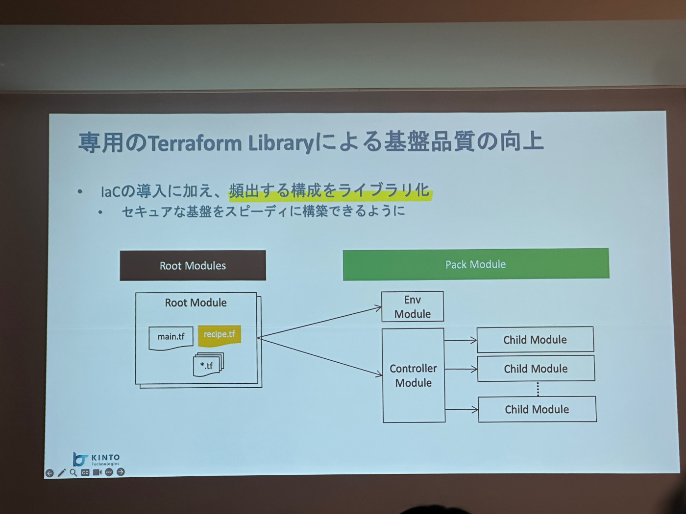 特に印象的だったのは、頻出するインフラ構成をライブラリ化しスピーディーに構築できるようにした話でした。