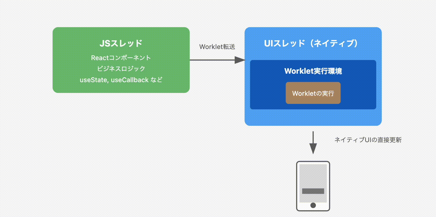 しかし、JSスレッドで重い処理が実行されている場合(例:大量のデータの処理やコンポーネントの再レンダリング)、アニメーションが影響を受ける可能性があります。これを解決するのがワークレットです。