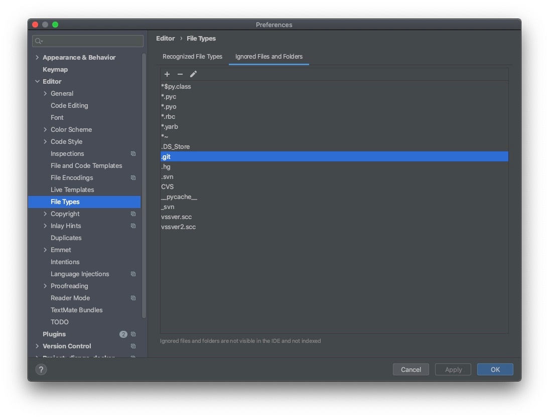- 「Editor」→「File Types」→「Ignored Files and Folders」