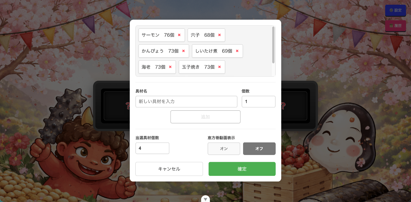 - 恵方巻き具材抽選機能