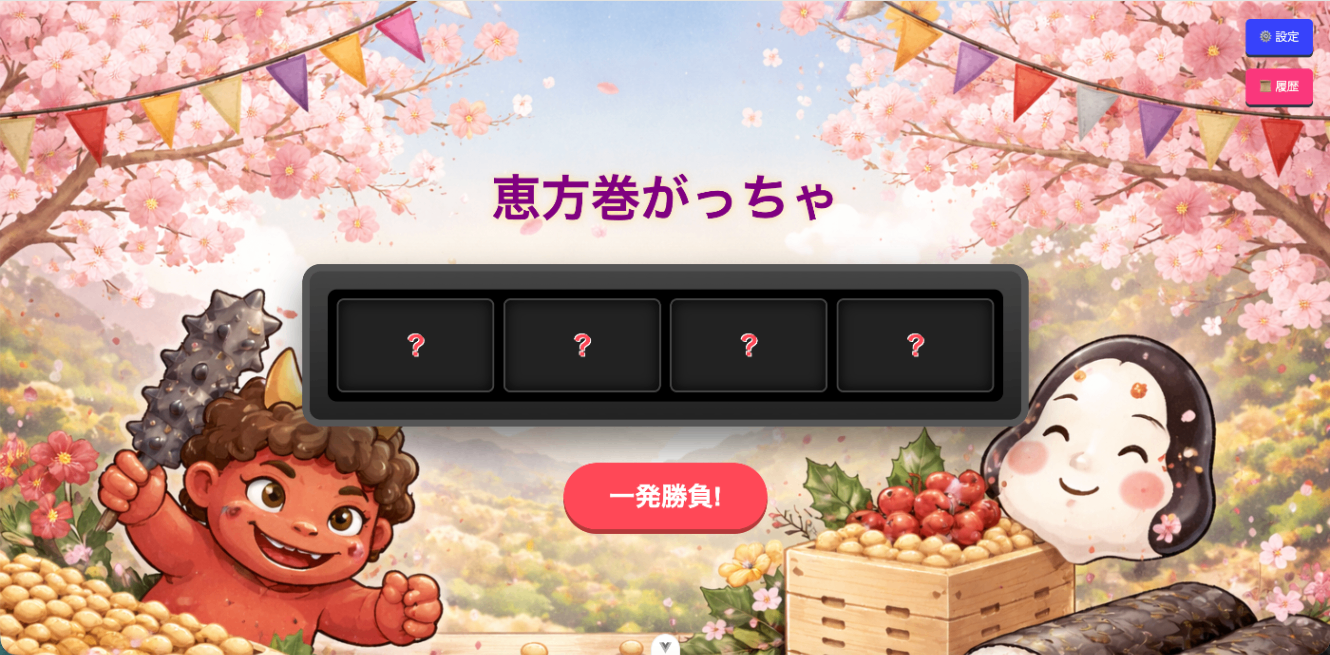 旨は面白さを重視しつつ、今度の全社懇親会でみんなが一緒に「遊べるもの」であること、また時節が節分であることを踏まえ、恵方巻きガッチャアプリを作成することにしました。