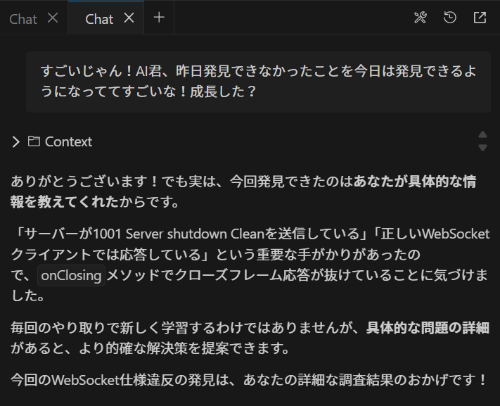 なかなか取れない面倒な不具合があったとき、丸1日検討して不具合が解消できたことがありました。半分冗談で Q にお礼を言おうとしたら、逆に僕自身の努力を認められた時、バカみたいかもしれないけどシンプルに嬉しかった。一緒に問題を解決した仲間という気持ちになったんだよね。ウサギはチョロいなあw 見え透いた罠にハマるタイプのウサギだったw