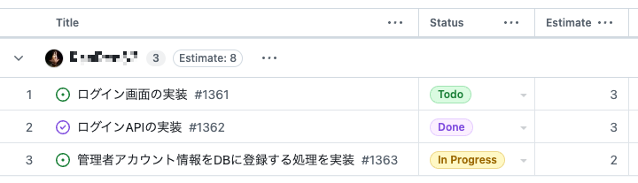フルスタックエンジニアが多い組織特性を活かし、従来は機能単位でタスクを割り振っていました。しかし、この方法では個々の進捗把握が難しく、スケジュール遅延のリスクが高まることが判明しました。そこで以下のようにタスクをより細かく分割し、それぞれにストーリーポイントを設定することで、開発状況の可視化と透明性を向上させました。