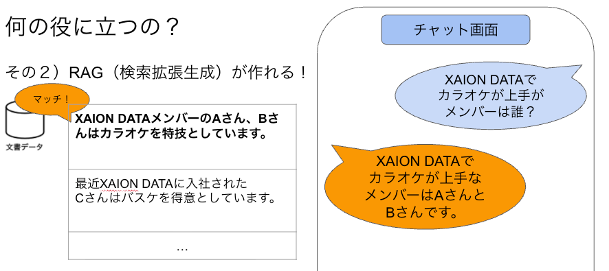 このように社内ドキュメント(左)を作っておけば、質問が来た時にドキュメントに対してベクトル検索をし、マッチした文書をもとに回答を作ってくれる「社内ボット」が作れるのです。