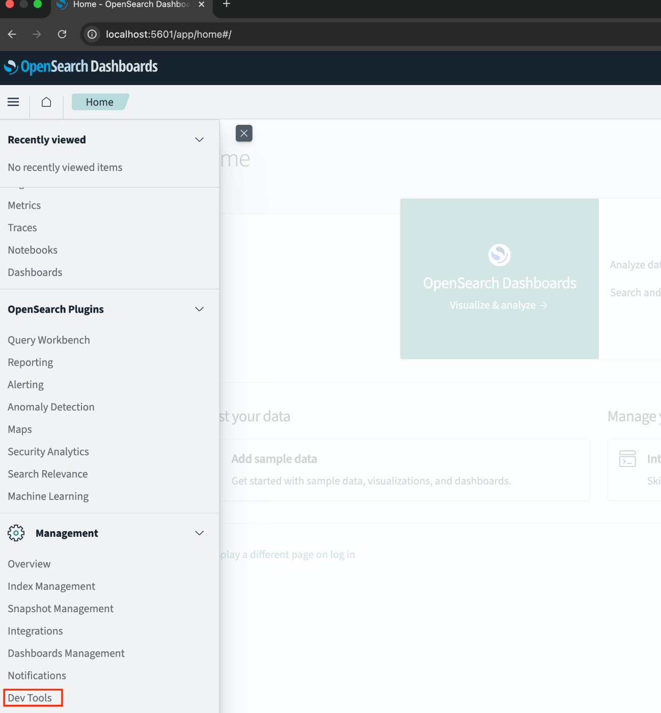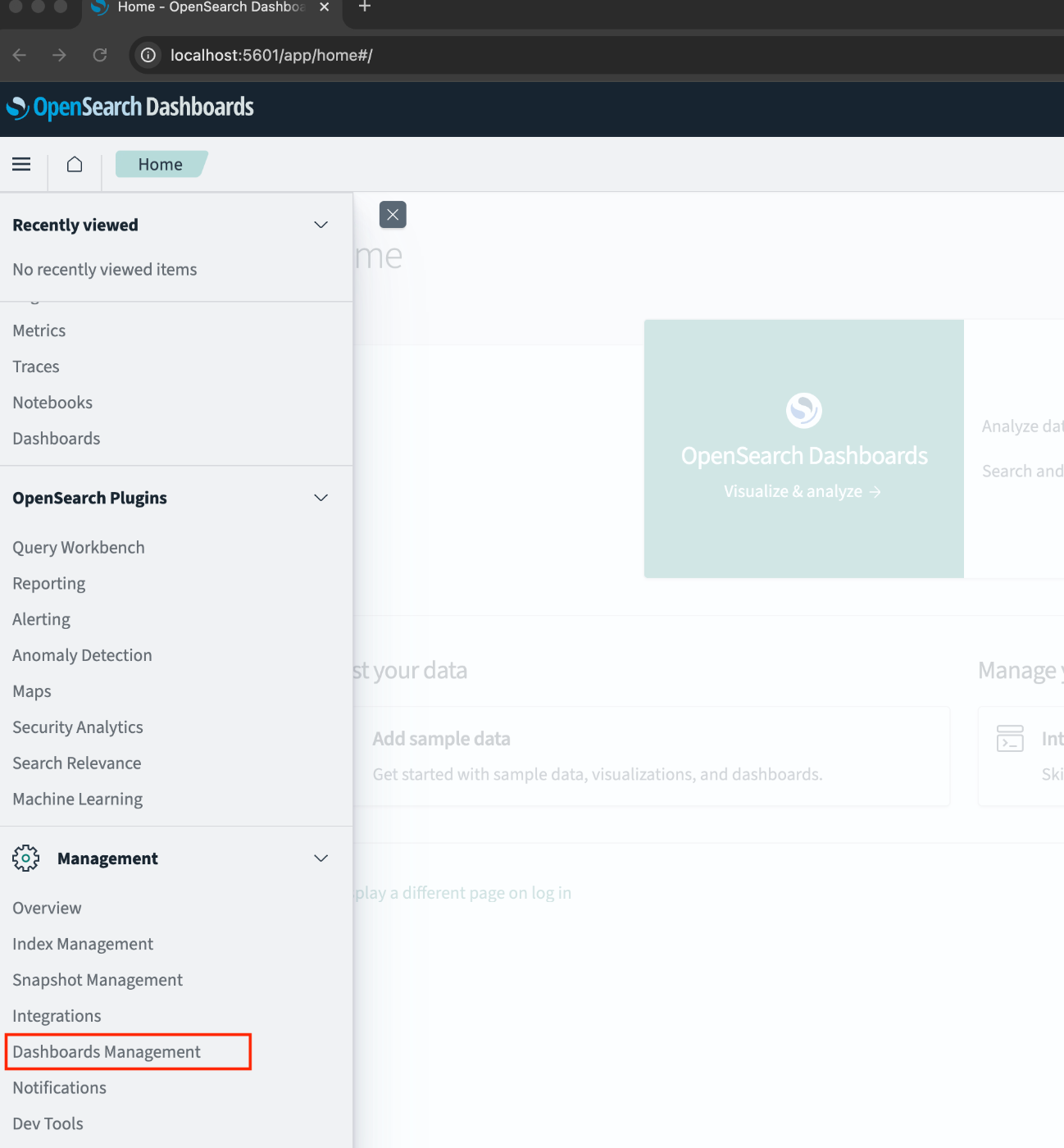 左上のハンバーガーメニューを選択し、DashboardsManagement を選択します。