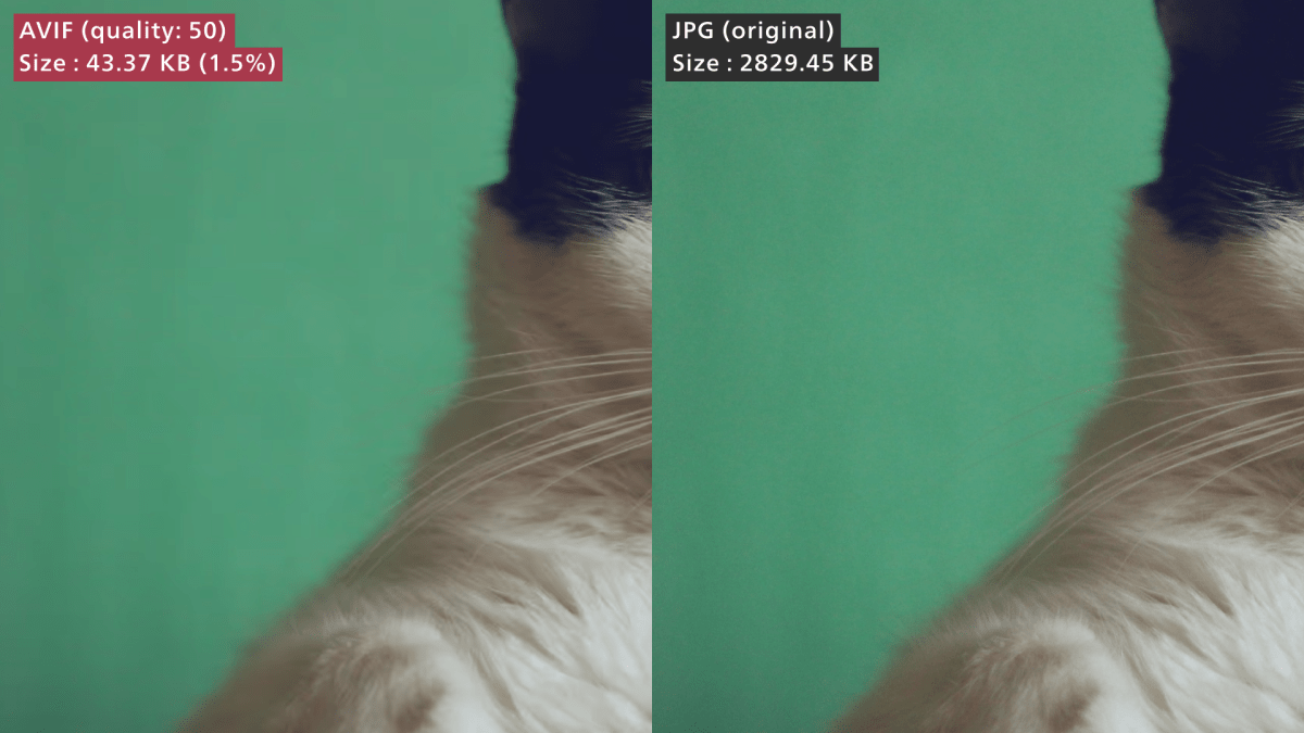 値を合わせて比較することに意味が無いため、案件の使用想定の画質合わせでAVIFはquality: 60