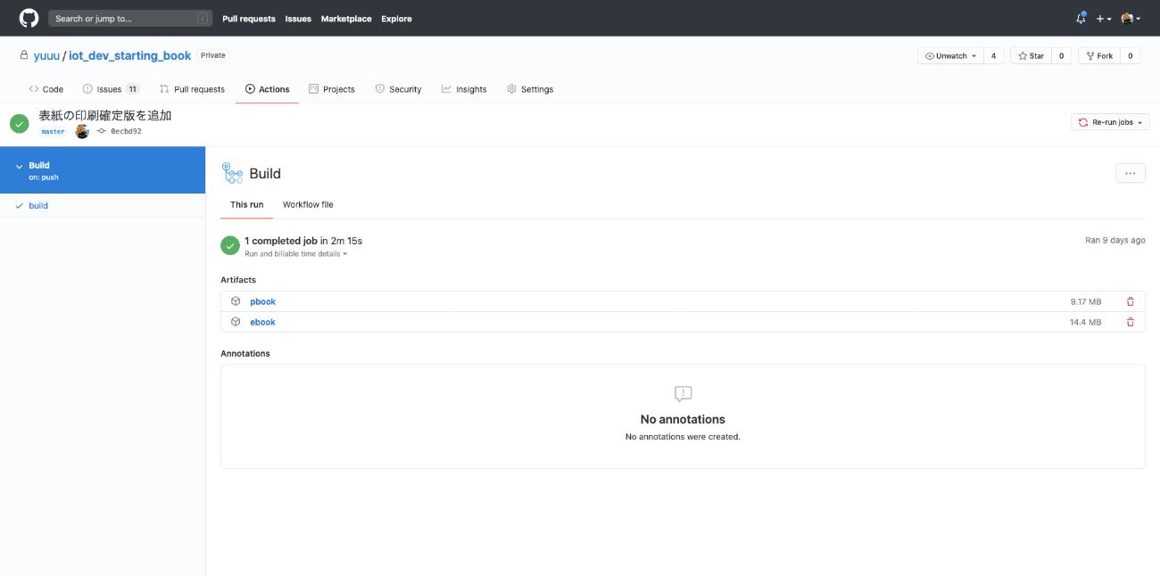 さらに、masterブランチにmergeしたタイミングで紙版・電子版をビルドするよう設定していました。