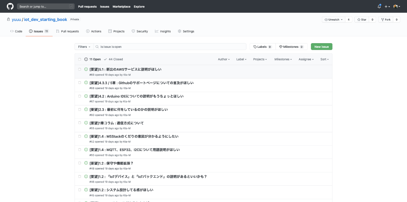 GitHubのリポジトリに招待して、指摘をIssueにあげてもらいました。