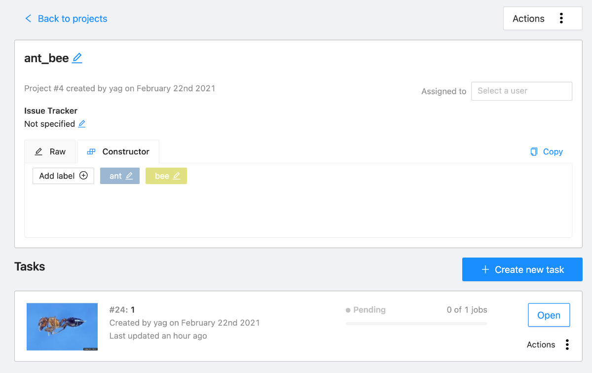 ボタンから新規Projectを作成します。CVATでは、Project→Taskというような階層構造になっており、一つのプロジェクトの中に複数のタスクが含まれます。Projectではプロジェクト名とラベルを設定できます。今回は蜂と蟻の2クラスですので、ラベルはant