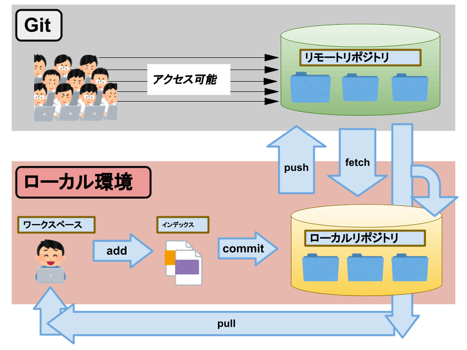 - ローカルリポジトリ:PCからしかアクセスできないクローズドな保管庫