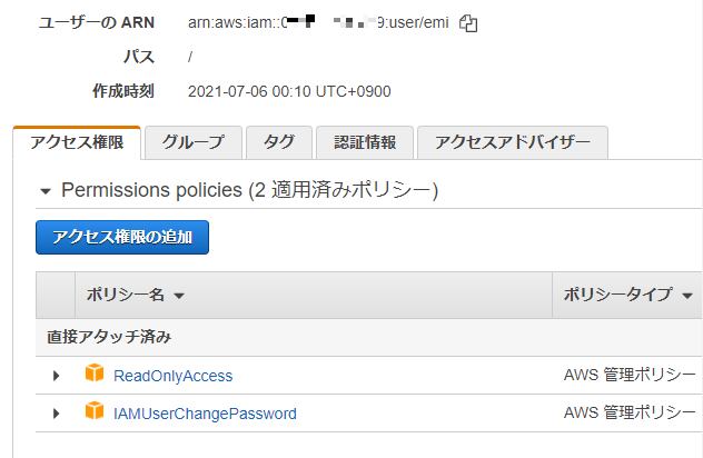 エミ「これか。えーっと...権限...ポリシーは、ReadOnlyAccess と IAMUserChangePassword か。」