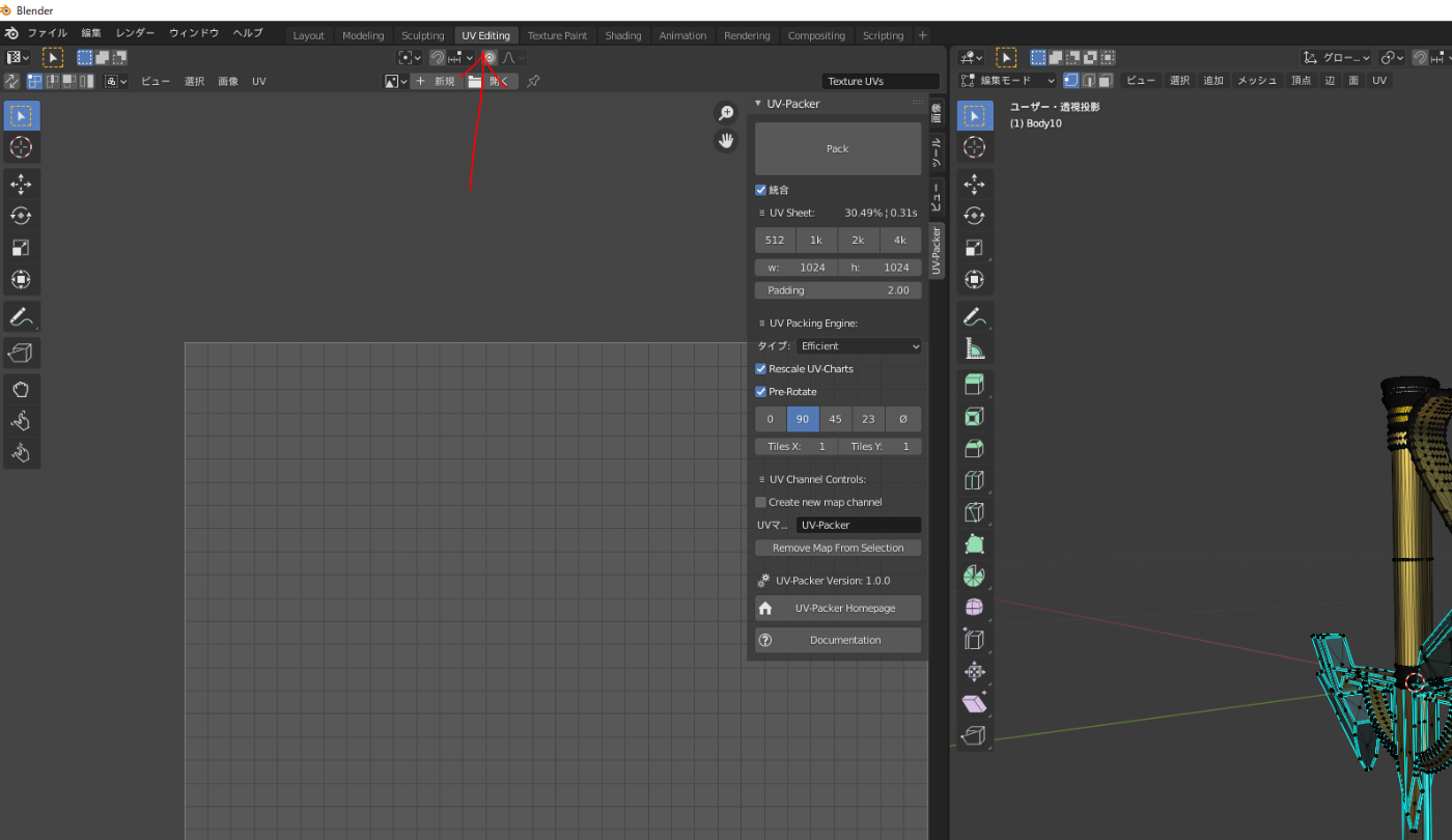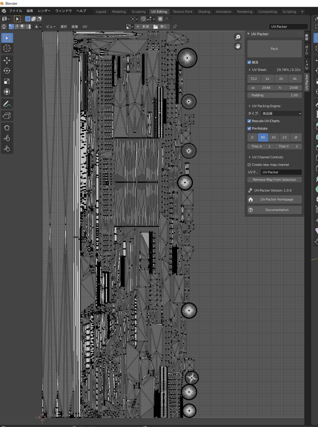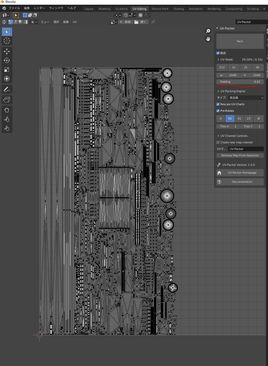 Blnder向けの無料アドオンのUV-Packer for Blenderを利用します。