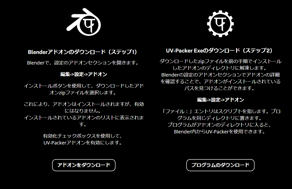 インポートする前に、Blender向けのUVアドオンを別途いれます。