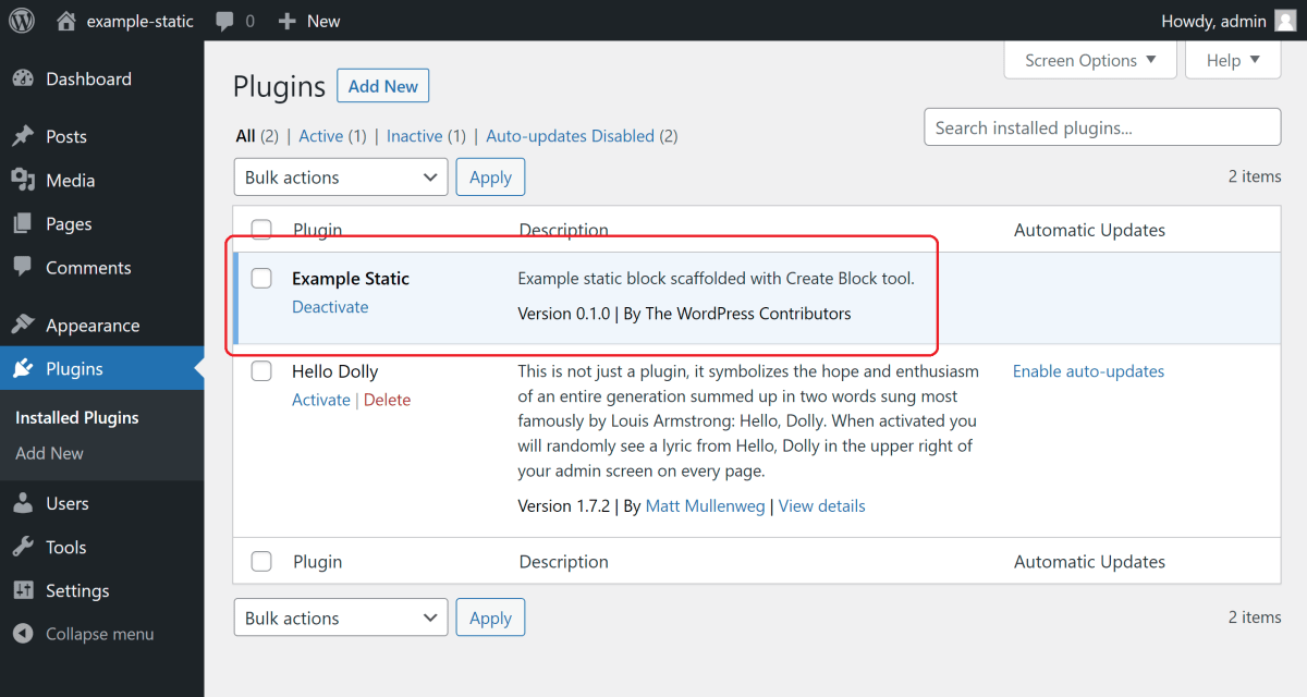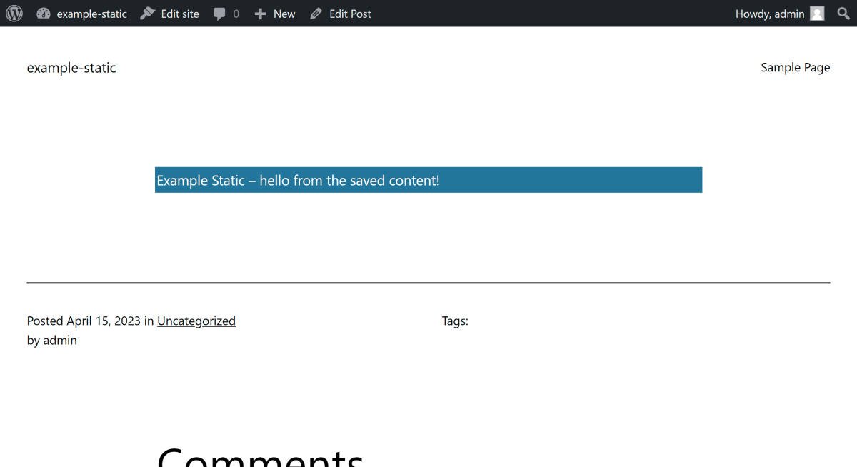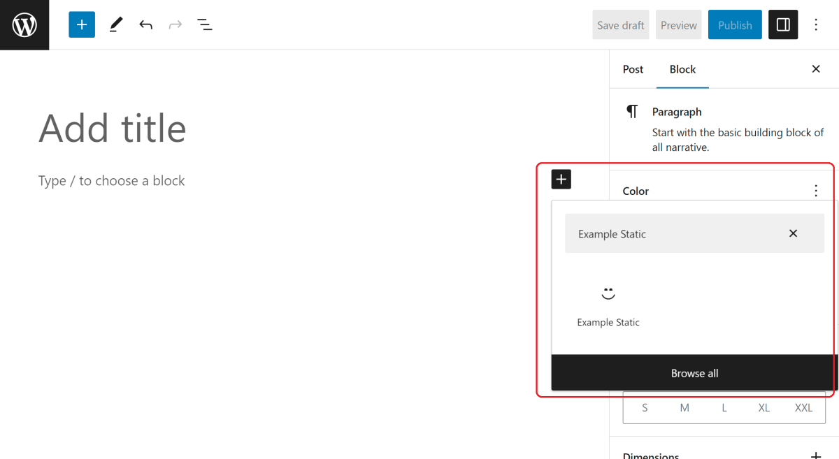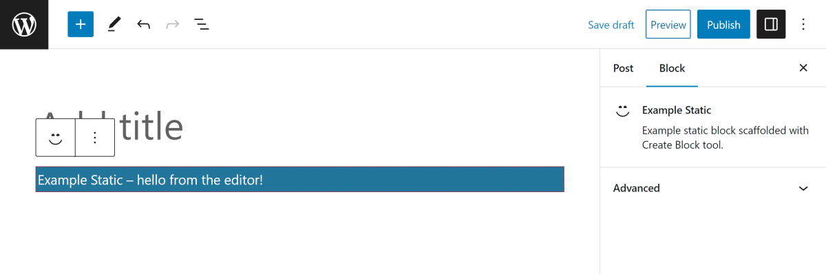 ? The short description for your block (optional): Example static block scaffolded with Create Block tool.