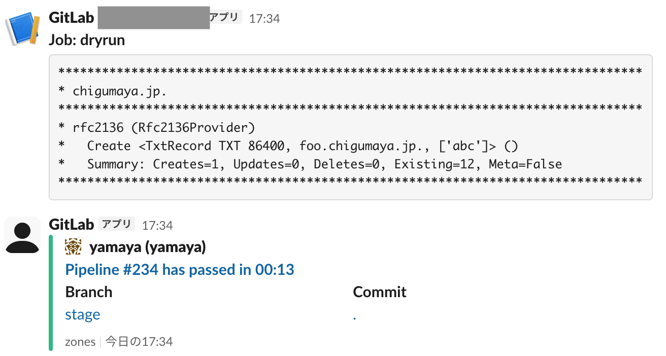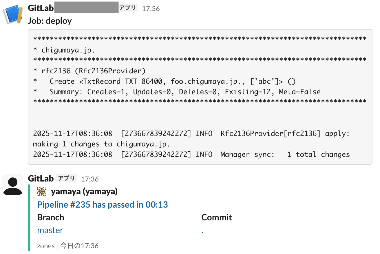 octodns自体でもゾーンの内容チェックはしているが、けっこう穴がある。実際、テストコードで使われてるゾーンファイルにいくつか間違いがある(グルーなしの委任など)。そのため、dryrunに成功するのにdeployに失敗するという事態が起きないよう、octodnsとは別にゾーンのバリデーションをしておいたほうがよい。今回の例では更新先のサーバがKnotなのでそれにあわせてknot付属のkzonecheckを使っているが、named-checkzoneなどでもよい(その場合、.gitlab-ci.ymlでapt installしておく)。