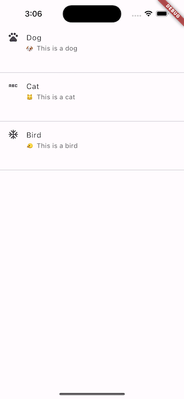Text('${e.emoji} This is a ${e.animal.toLowerCase()}'),