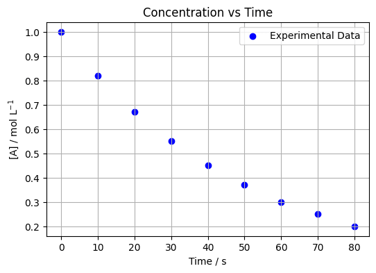 まずは得られた実験データ(時間 vs 濃度)をそのまま散布図としてプロットし、全体の傾向を確認します。