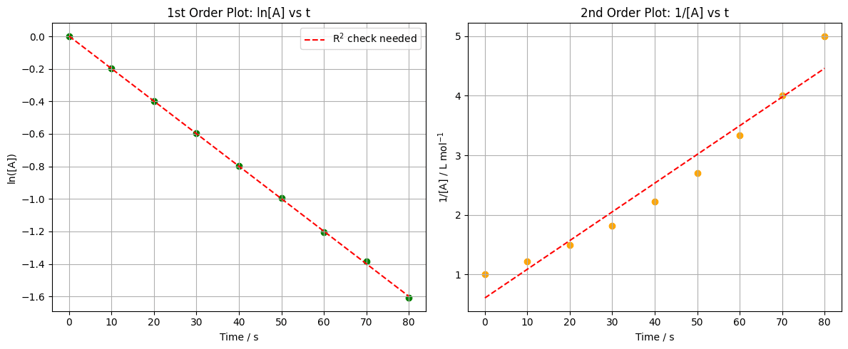 axes[0].set_title('1st Order Plot: ln[A] vs t')