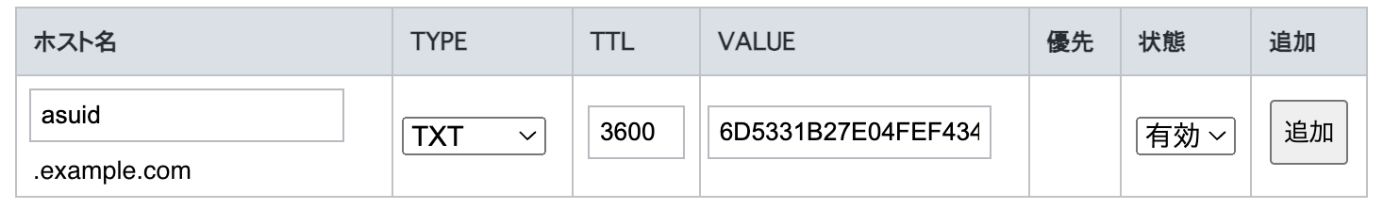 asuid.www.example-app.comというホストに対してTXTレコードを追加しましょう。