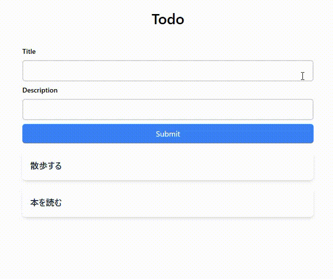 ここまでで、http://localhost:3000にアクセスし、Todoを入力して送信すると、APIサーバーにリクエストが送信され、データベースに保存されるようになります。データベースに保存されているため、リロードを押しても、データが消えていないことが確認できると思います。