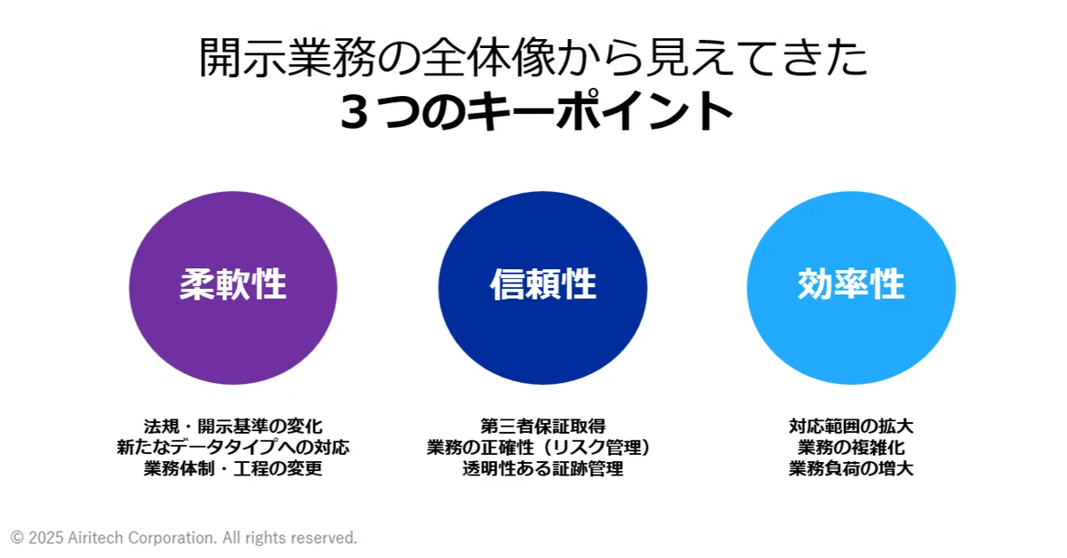 :法規・開示基準の変化、新たなデータタイプへの対応、業務体制・工程の変更