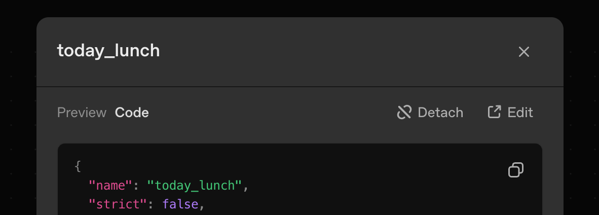 ウィジェット名修正後にagent builderのwidgetプレビュー画面で確認すると、nameパラメータにちゃんと値が入っていることが確認できます。