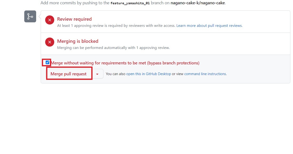 ※上記画像はデフォルトの設定ではなく、ブランチを保護する設定をかけています。マストではありませんが他メンバーの承認がなければマージができないように保護をかけています。方法は下記で詳しく載せてくれていますので参照ください。