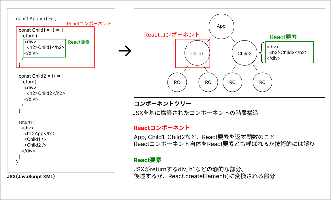 Reactは、JSXで記述された関数を1つのUI部品(Reactコンポーネント)として扱い、それらを組み合わせて仮想的な構造(コンポーネントツリー)を作成します。