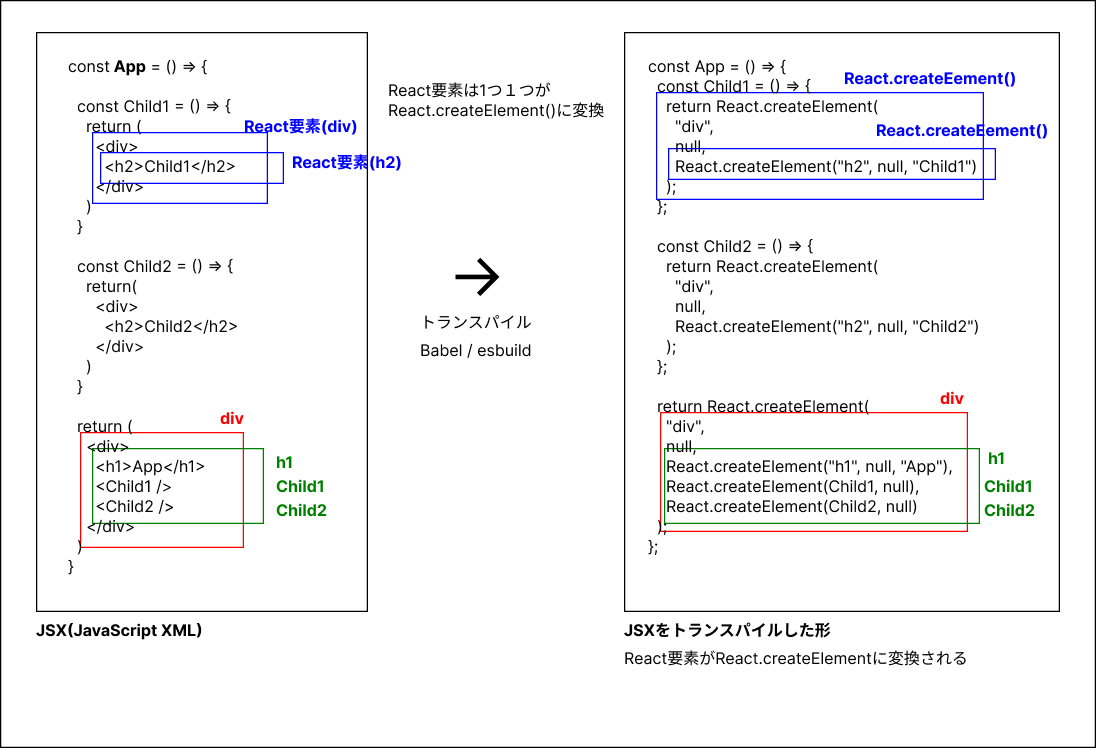 JSXはそのままではブラウザが解釈できないため、ビルドの過程で、Babel(webpack版)やesbuild(vite版)によって React.createElementの形式にトランスパイルされます。さらに、その後のステップで圧縮・最適化された状態に変換されます。