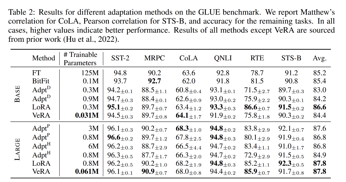 VeRAは両方のモデルにおいて LoRA と同等の性能を示し、しかも桁違いに少ないパラメータでこれらの結果を達成していることがわかる。RoBERTabaseの性能が若干低下したのは、実験で使用した配列長が短くなったためである。相対的には性能向上しているものと考えられる。