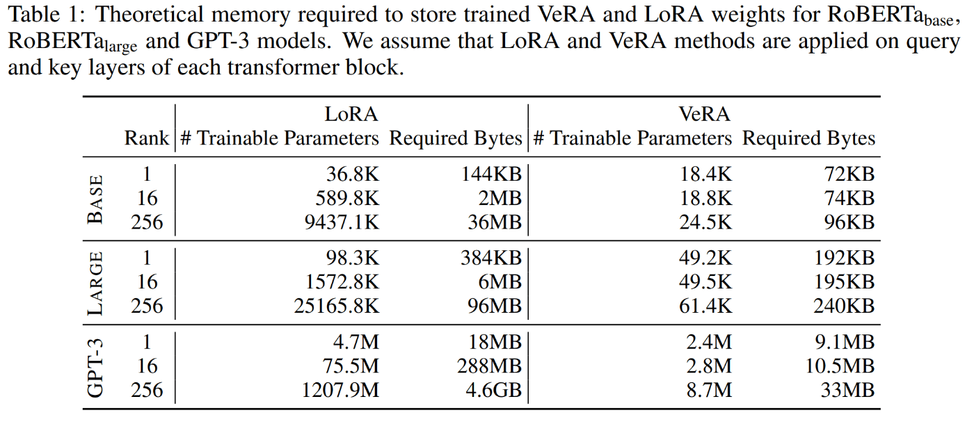 下表はRoBERTabase,RoBERTalarge,GPT-3各モデルに対し既存手法であるLoRAと本研究の手法であるVeRAを適用した際の理論上のパラメータ数及びその必要メモリ数