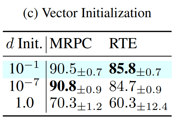 はゼロに初期化され、これはLoRAにおける行列Bの初期化と一致し、最初のフォワード・パス中に重み行列が影響を受けないことを保証する。スケーリング・ベクトルb は、その全要素にわたってゼロでない値で初期化され、それにより、より良いパフォーマンスを得るために調整することができる新しいハイパーパラメータが導入される。具体的には、低ランク行列は正規分布を使用して初期化され、d ベクトルは 1 で初期化される。d およびA の一様分布やB のゼロ以外の定数など、別の初期化も実験では検討されている(下記ablation study項参照)。d