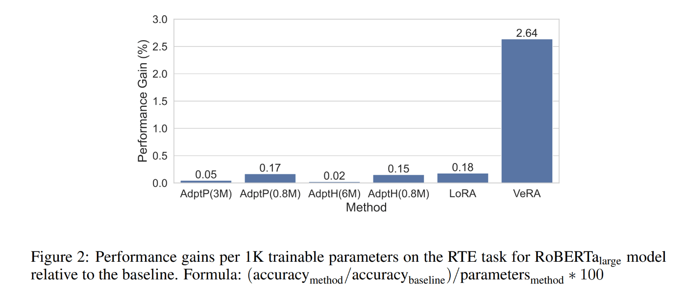 上図は、各手法の効率を、学習可能なパラメータ 1K 個あたりの性能向上という観点から定量化したものである。重点的に比較するために、RTE タスクと RoBERTalarge モデルを選択した。ベースラインを確立するために、分類ヘッドのみを訓練し、残りのモデルは凍結する補助実験を行う。このベースラインは、VeRAと同じハイパーパラメータを用いて構築される。次に、ベースラインに対して、導入された追加訓練可能パラメータによって正規化された、各方法に起因する性能利得を評価する。その結果、VeRAが1K個の訓練可能パラメータあたりで最も高い性能をもたらすことが明らかになった。