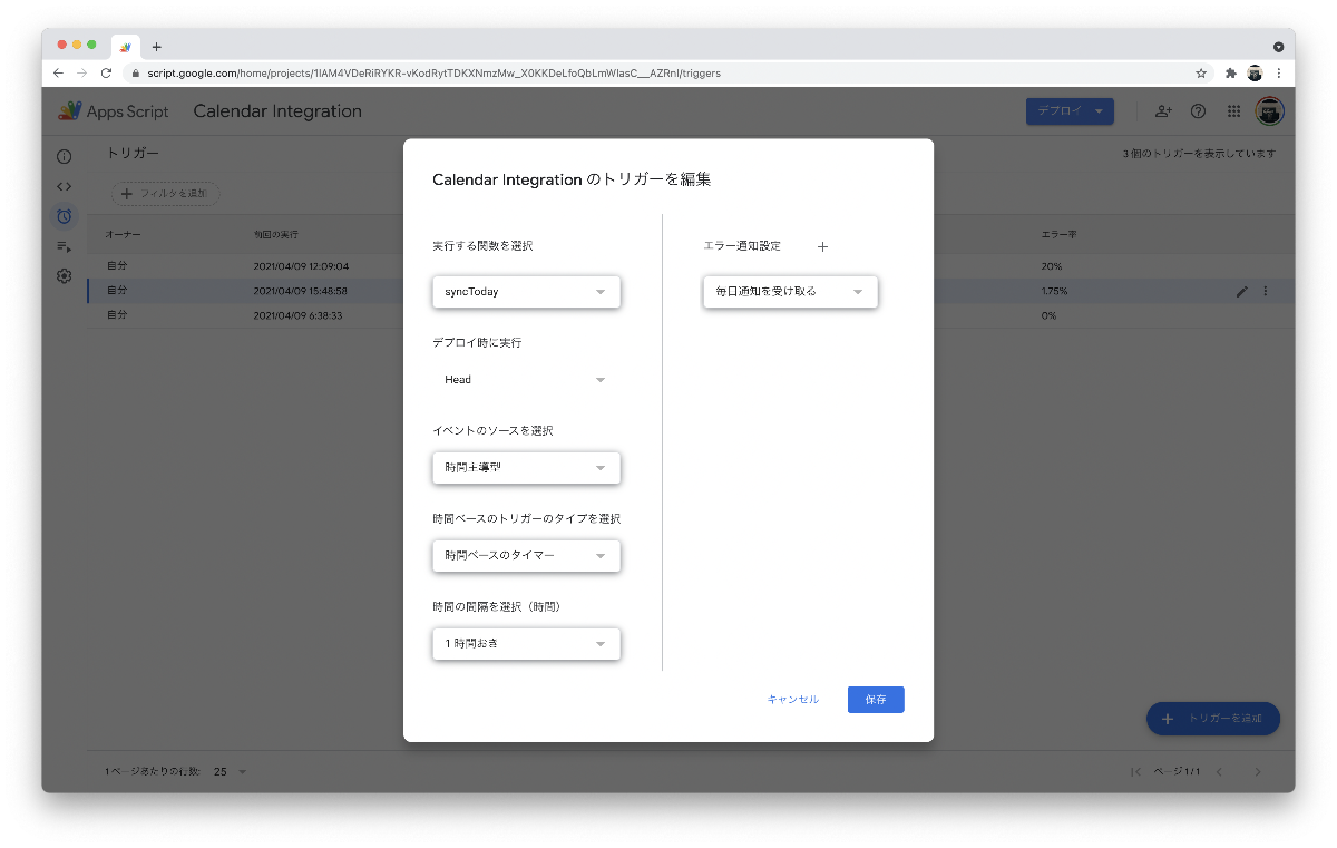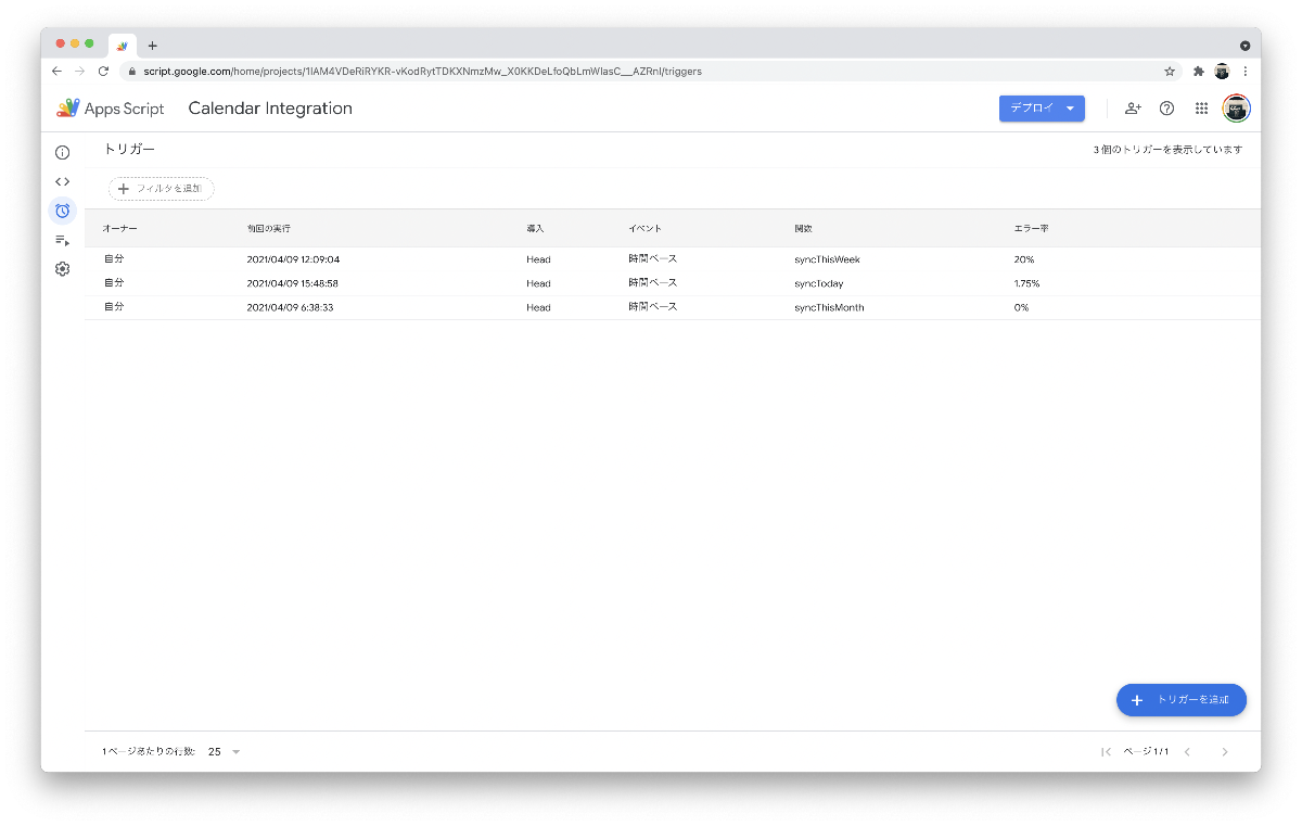 まずは上記のプログラムをScript Editorにコピペし、一度実行してみてください。それが成功したら、最後にトリガーをセットし、自動化します。先述のエラーを防ぐため、最も負荷の高い syncThisMonth() は頻度を低く、syncToday() は最新の情報であることが求められるため頻度を高く設定します。これはご自身の感覚で設定してください。参考までに自分の設定をお示しします。