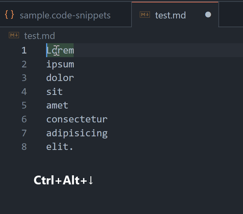 動作サンプル。Ctrl+Alt+↓で複数行マルチカーソル状態に。