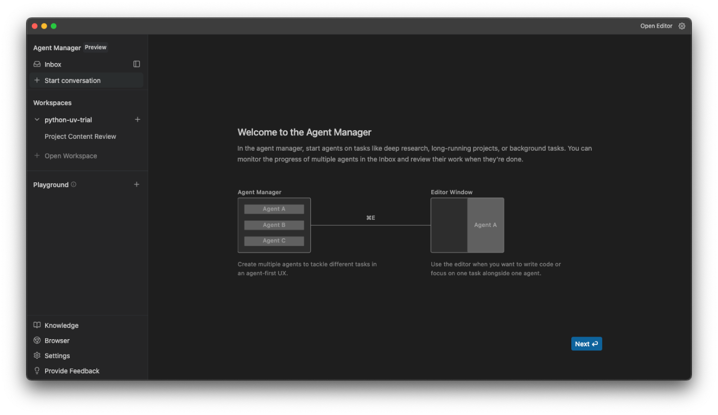 複数のワークスペースで並行して作業しながら、それぞれで動作しているエージェントを一元管理できるみたいです。今回は一つのワークスペースしか使いませんでしたが、Agent Managerから操作してみました。