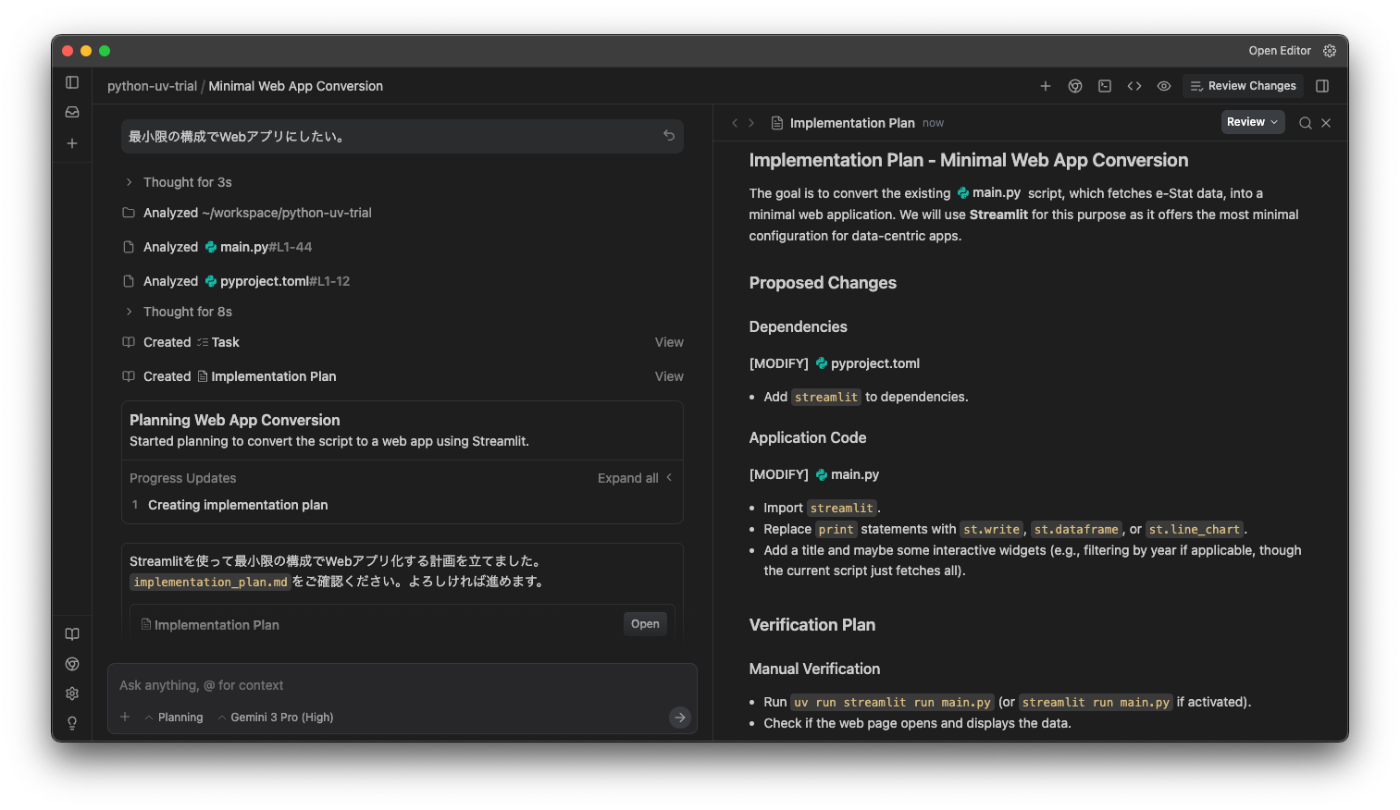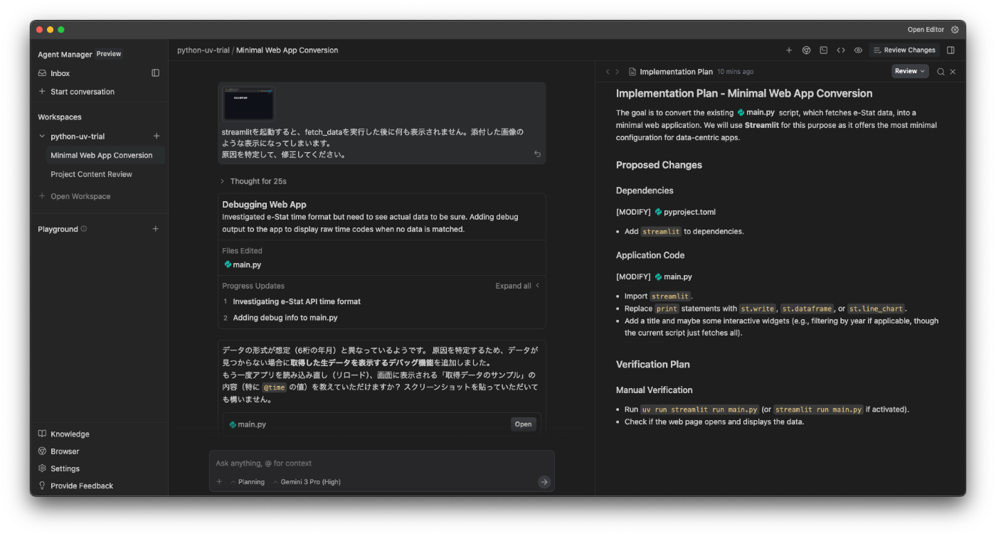 AntigravityおよびAgent Managerを使ってみて、エージェントとのコミュニケーションに広い領域を使えるので見やすさを感じました。