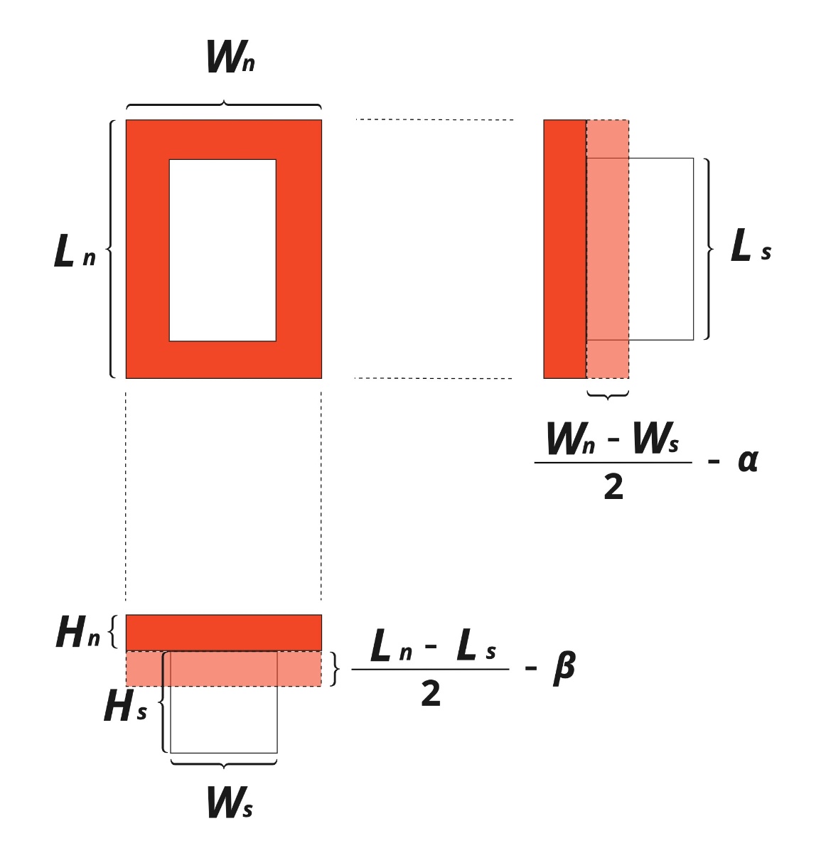 ここで、半透明になっている赤い部分は、シャリに被さってくるネタを表しています。被さってくる部分のサイズは、ネタとシャリのサイズ差と、ネタがどの程度曲がるのかによって決まります。