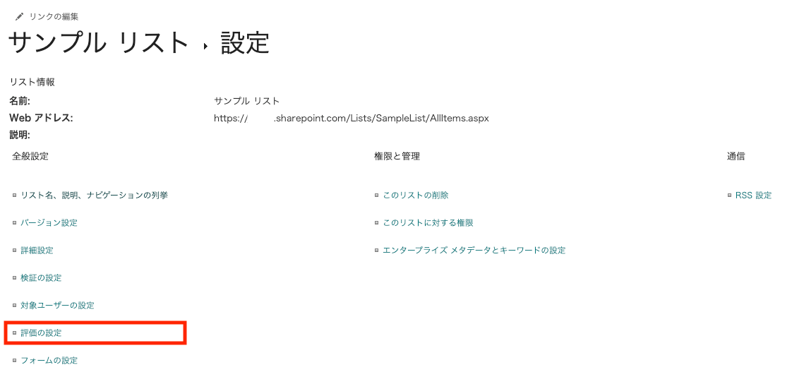 がないという事象は、サイトコレクションがチームサイトであれば問題なく表示されます。しかし、サイトコレクションがコミュニケーションサイトで作成されている場合、サブサイト以下に作成されているリストについても、評価の設定