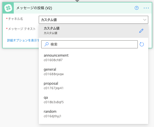 チャネル名には、メッセージを投稿する先のチャンネルを設定します。検索窓を使ってチャンネル名を検索するか、カスタム値を使ってチャンネル名を直接入力してください。