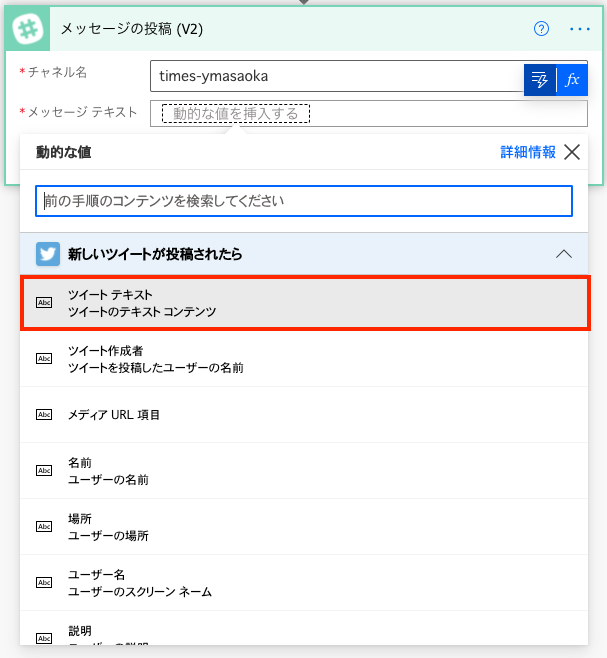 動的な値の一覧から、Twitter コネクタのツイートテキストを選択します。これで、Twitter コネクタ側で取得した新規ツイートのツイート本文をメッセージテキストに設定できます。