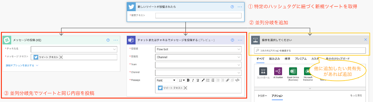 そのため、Twitter コネクタのトリガーが起動したら、Slack コネクタの操作と並列で Teams コネクターの操作が行われるよう、並列分岐を追加します。