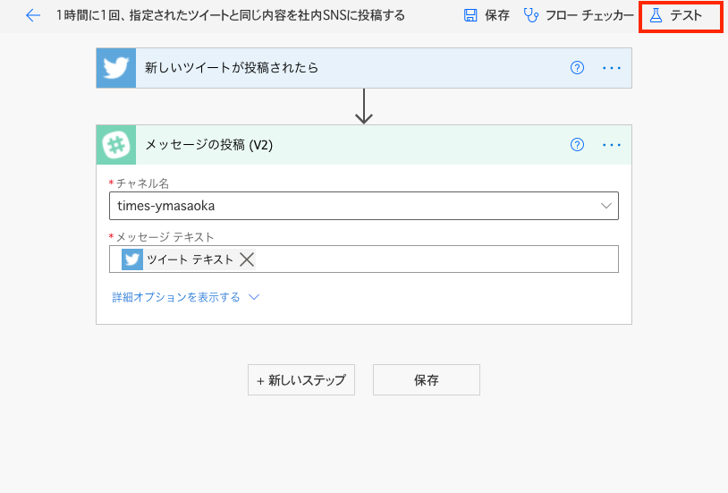 以上が Slack コネクタでの必須設定です。これで、Twitter で新規ツイートから Slack に投稿されるまでのフローの設定が完了しました。