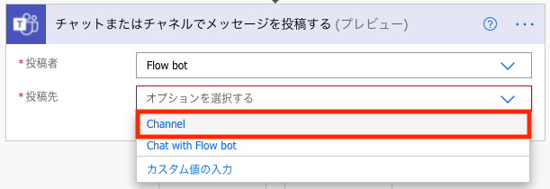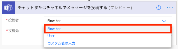 投稿者の部分では、メッセージの投稿者をボットにするかコネクタで認証しているユーザーにするかを選択できます。今回はボットに設定します。