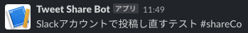 これで、Twitter のツイートが Slack のチャンネルに投稿される際、アプリではなくコネクタで認証しているユーザーアカウントが使われるようになります。