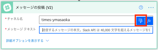 設定後、メッセージの投稿先のチャネル情報、および実際に投稿するメッセージ本文を設定できる項目が追加で表示されるようになります。