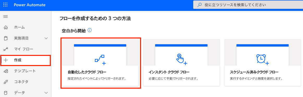 Power Automate のホーム画面にアクセスし、メニューにある作成を選択します。